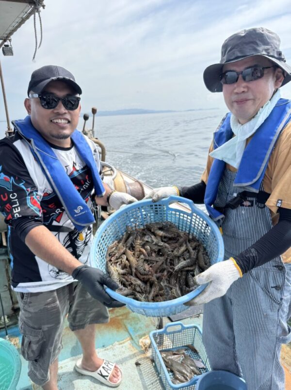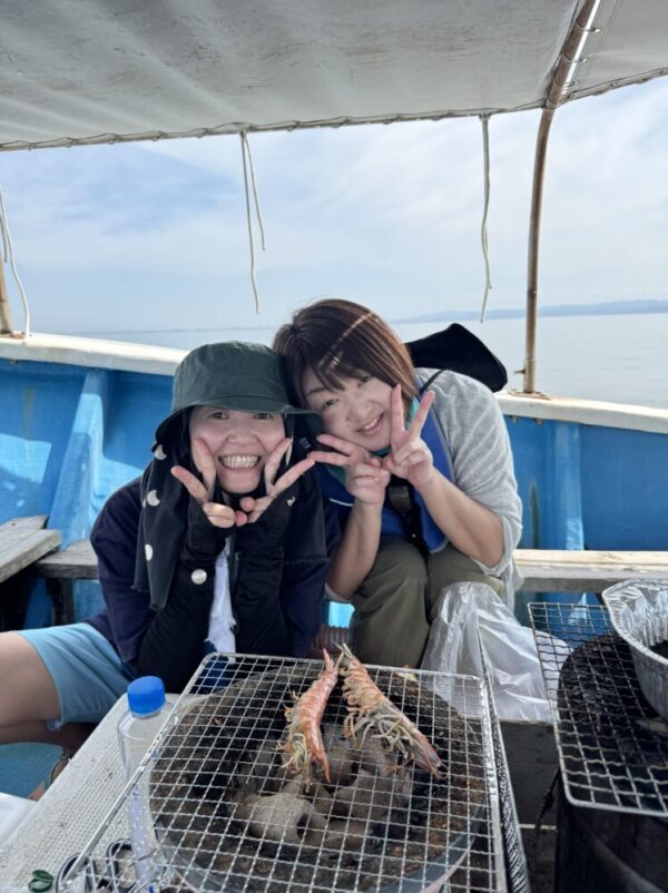 船上では、次から次へとアルコールや食べ物がクーラーボックスから登場し、獲れたてのクルマエビは七輪ですぐ塩焼きに😍